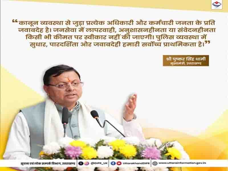 “कानून व्यवस्था से जुड़ा प्रत्येक अधिकारी-कर्मचारी जनता के प्रति जवाबदेह है: मुख्यमंत्री Posted on December 28, 2025December 29, 2025 by Admin Shareदेहरादून: “कानून व्यवस्था से जुड़ा प्रत्येक अधिकारी-कर्मचारी जनता के प्रति जवाबदेह है। जनसेवा में लापरवाही, अनुशासनहीनता या संवेदनहीनता किसी भी कीमत पर स्वीकार नहीं की जाएगी।”: मुख्यमंत्री पुष्कर सिंह धामी