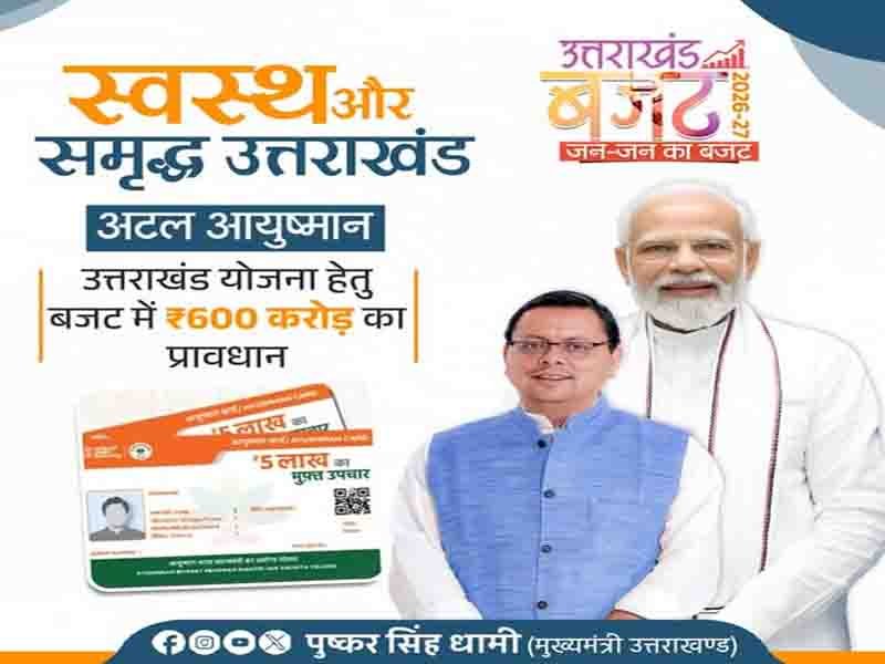 इसी जनकल्याणकारी पहल को और अधिक प्रभावी ढंग से आगे बढ़ाते हुए हमारी सरकार ने बजट सत्र 2026–27 में अटल आयुष्मान उत्तराखंड योजना के लिए ₹600 करोड़ का प्रावधान किया है। यह निर्णय प्रदेश के प्रत्येक नागरिक को बेहतर, सुलभ और गुणवत्तापूर्ण स्वास्थ्य सेवाएं उपलब्ध कराने की हमारी प्रतिबद्धता को और अधिक सशक्त करेगा तथा “स्वस्थ उत्तराखंड” के संकल्प को नई गति प्रदान करेगा:”(मुख्यमंत्री पुष्कर सिंह धामी )