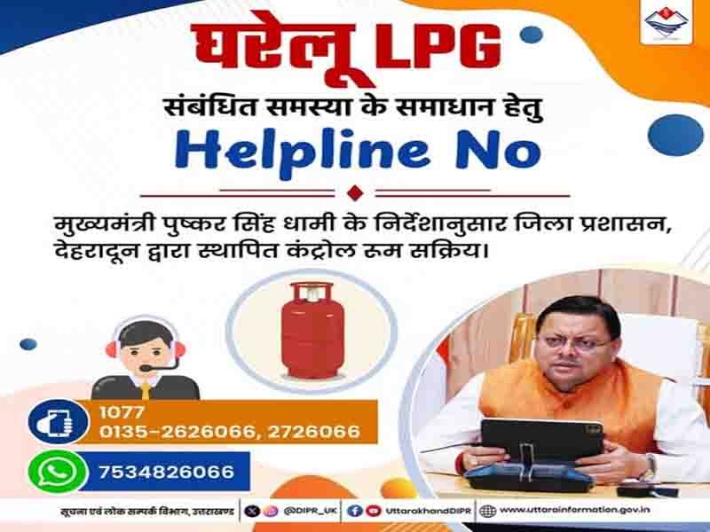 देहरादून: मुख्यमंत्री पुष्कर सिंह धामी के निर्देशानुसार, घरेलू LPG संबंधित समस्या के समाधान हेतु जिला प्रशासन, देहरादून द्वारा कंट्रोल रूम सक्रिय, जारी किए हेल्पलाइन नंबर