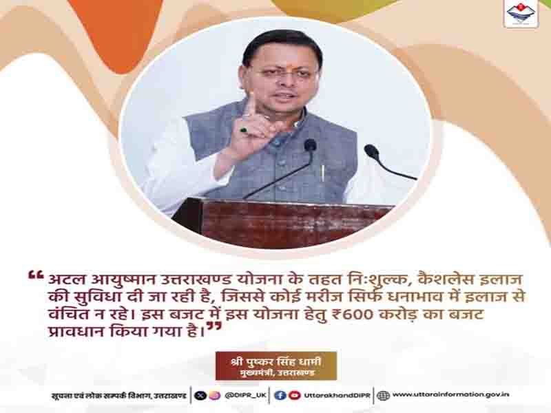 देहरादून: “अटल आयुष्मान उत्तराखण्ड योजना के तहत निःशुल्क, कैशलेस इलाज की सुविधा दी जा रही है, जिससे कोई मरीज सिर्फ धनाभाव में इलाज से वंचित न रहे। इस बजट में इस योजना हेतु ₹600 करोड़ का बजट प्रावधान किया गया है।”: मुख्यमंत्री पुष्कर सिंह धामी।