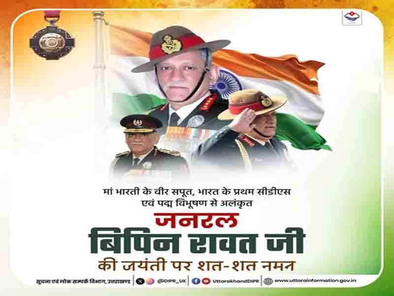 मां भारती के वीर सपूत जनरल बिपिन रावत जी की जयंती पर उन्हें शत-शत नमन Posted on March 16, 2026March 16, 2026 by Admin Shareदेहरादून: मां भारती के वीर सपूत, भारत के प्रथम सीडीएस एवं पद्म विभूषण से अलंकृत जनरल बिपिन रावत जी की जयंती पर उन्हें शत-शत नमन।