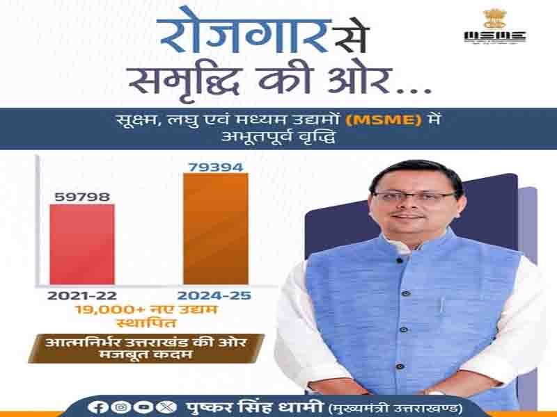 देहरादून: युवाओं को आत्मनिर्भर बनाने के दृढ़ संकल्प के साथ हमारी सरकार कृतसंकल्पित भाव से कार्य कर रही है। इन्हीं प्रयासों का परिणाम है कि प्रदेश में MSME इकाइयों की संख्या 59,798 (वर्ष 2021-22) से बढ़कर 79,394 (वर्ष 2024-25) हो गई है। यह वृद्धि प्रदेश में उद्योगों के लिए अनुकूल वातावरण को दर्शाती है:”(मुख्यमंत्री पुष्कर सिंह धामी )