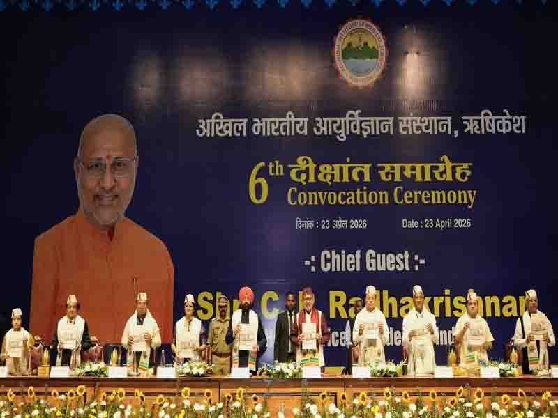 उपराष्ट्रपति सी. पी. राधाकृष्णन ने एम्स के छठे दीक्षांत समारोह को किया संबोधित Posted on April 23, 2026April 24, 2026 by Admin Shareदेहरादून: उपराष्ट्रपति सी. पी. राधाकृष्णन ने एम्स के छठे दीक्षांत समारोह को संबोधित किया। इस अवसर पर राज्यपाल लेफ्टिनेंट जनरल गुरमीत सिंह (से.नि.) और मुख्यमंत्री पुष्कर सिंह धामी भी मौजूद रहे।